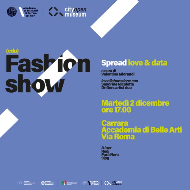 L’Accademia di Belle Arti di Carrara presenta “Edu Fashion Show – Spread Love & Data”, una sfilata partecipata che unisce moda, arte e attivazione civica. L’iniziativa rientra nel progetto PNRR City Open Museum, un programma dedicato alla valorizzazione culturale e alla costruzione di nuovi spazi di relazione tra cittadinanza, arte e territorio.
