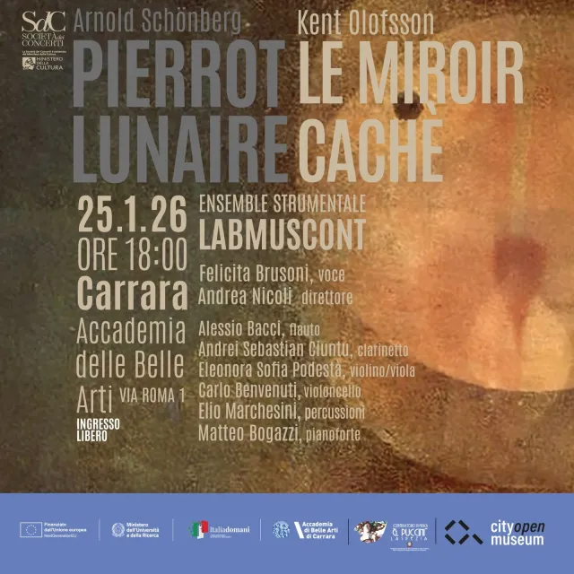 Tra eccellenze del territorio e artisti di fama internazionale, il programma si apre con una prima esecuzione italiana: Le miroir caché del compositore svedese Kent Olofsson, con il supporto video di Jörgen Dahlqvist. A seguire, il pubblico sarà immerso nelle atmosfere oniriche del Pierrot Lunaire op. 21 di Arnold Schönberg. Questa versione speciale non sarà solo un’esperienza d’ascolto, ma una vera e propria opera totale, arricchita dalle proiezioni originali curate dalla Scuola di Cinema dell’Accademia di Belle Arti di Carrara e dalle elaborazioni sonore di Raffaello Ciupi, nate all’interno del corso di Tecnico del Suono di Alberto Gatti (Conservatorio “Puccini” della Spezia).