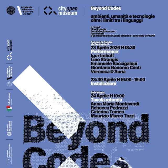All’interno di questo contesto si inserisce BEYOND CODES: ambienti, umanità e tecnologie oltre i limiti dei linguaggi, mostra-evento che inaugurerà giovedì 23 aprile 2026 alle ore 18:30 presso lo spazio Ex Paretra di Carrara. Il progetto, ideato e realizzato da Lino Strangis in collaborazione con Igor Imhoff e gli studenti della scuola di NTA (Nuove Tecnologie per l’Arte) dell’Accademia di Belle Arti di Carrara, trasforma un ex supermercato nel centro storico in un ambiente immersivo e multidimensionale.