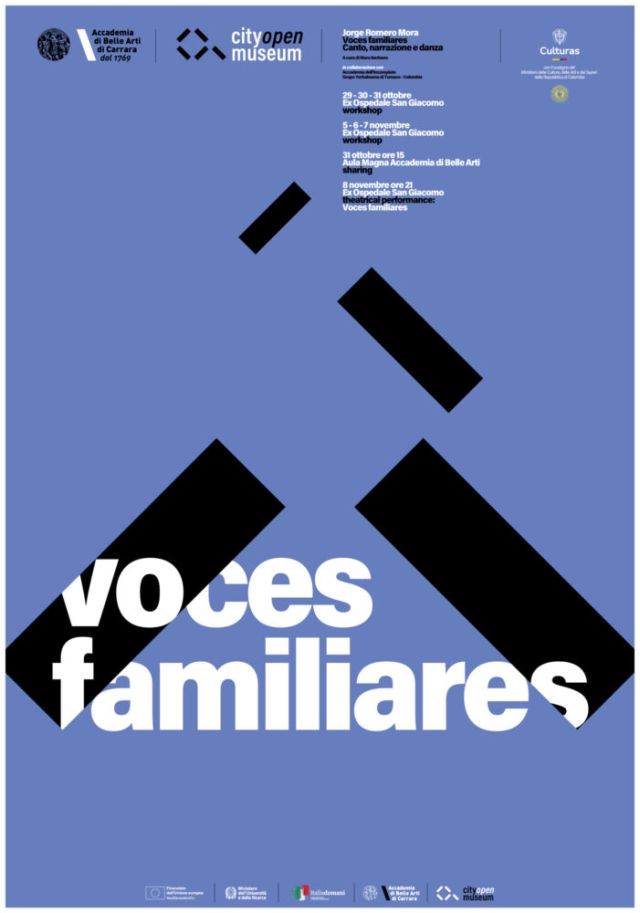Un progetto del PNRR Com a cura della Prof.ssa Mara Nerbano, realizzato dall’Accademia di Belle Arti di Carrara in collaborazione con l’Accademia dell’Incompiuto e con il patrocinio del Ministerio de las Culturas, las Artes y los Saberes della Colombia. che prevede tre tipologie di eventi: laboratorio teatrale di sei giorni destinato ad un massimo di 15 studenti dell’Accademia di Belle Arti di Carrara, conversatorio, spettacolo “Voces Familiares”.